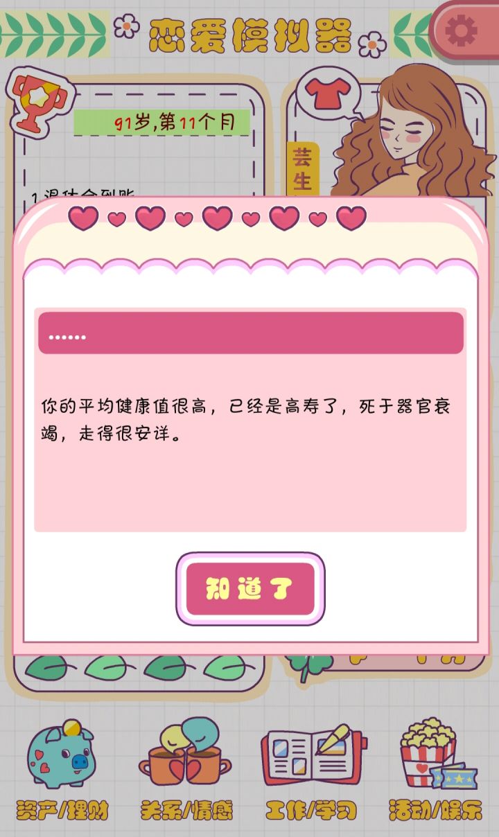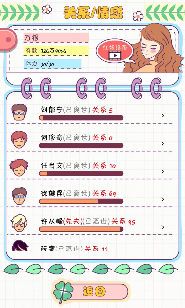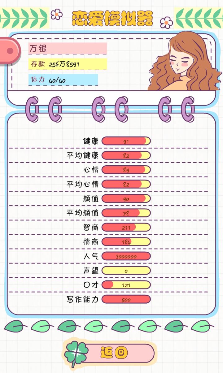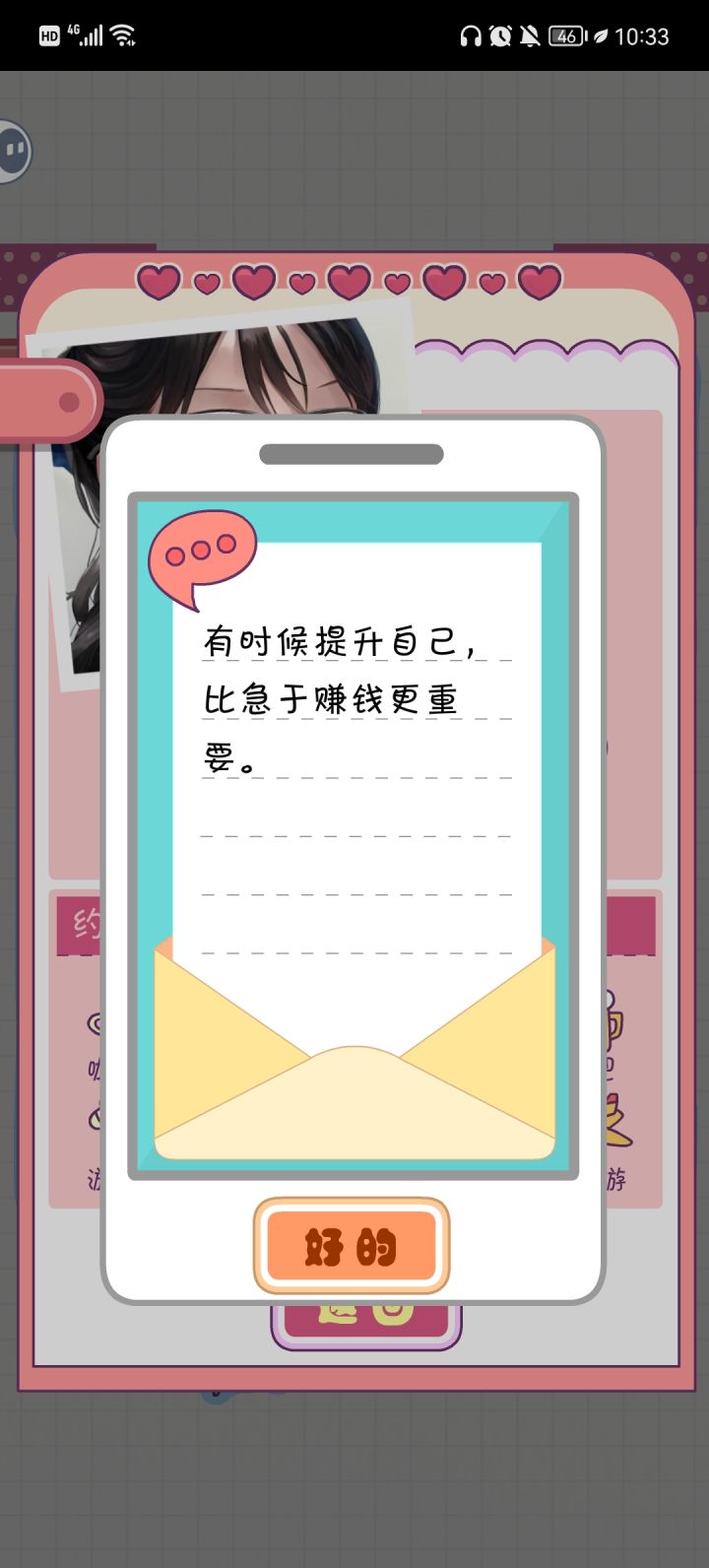 玩了好几遍,把存档都玩完了,重新下载一个,再试试其他玩法。总的来说,如果只赚钱的话,好感度没这么重要,前期只刷一个人的好感(刘郁宁),不浪费体力值,保证心情(其他人都是只聊天,慢慢涨起来的)。