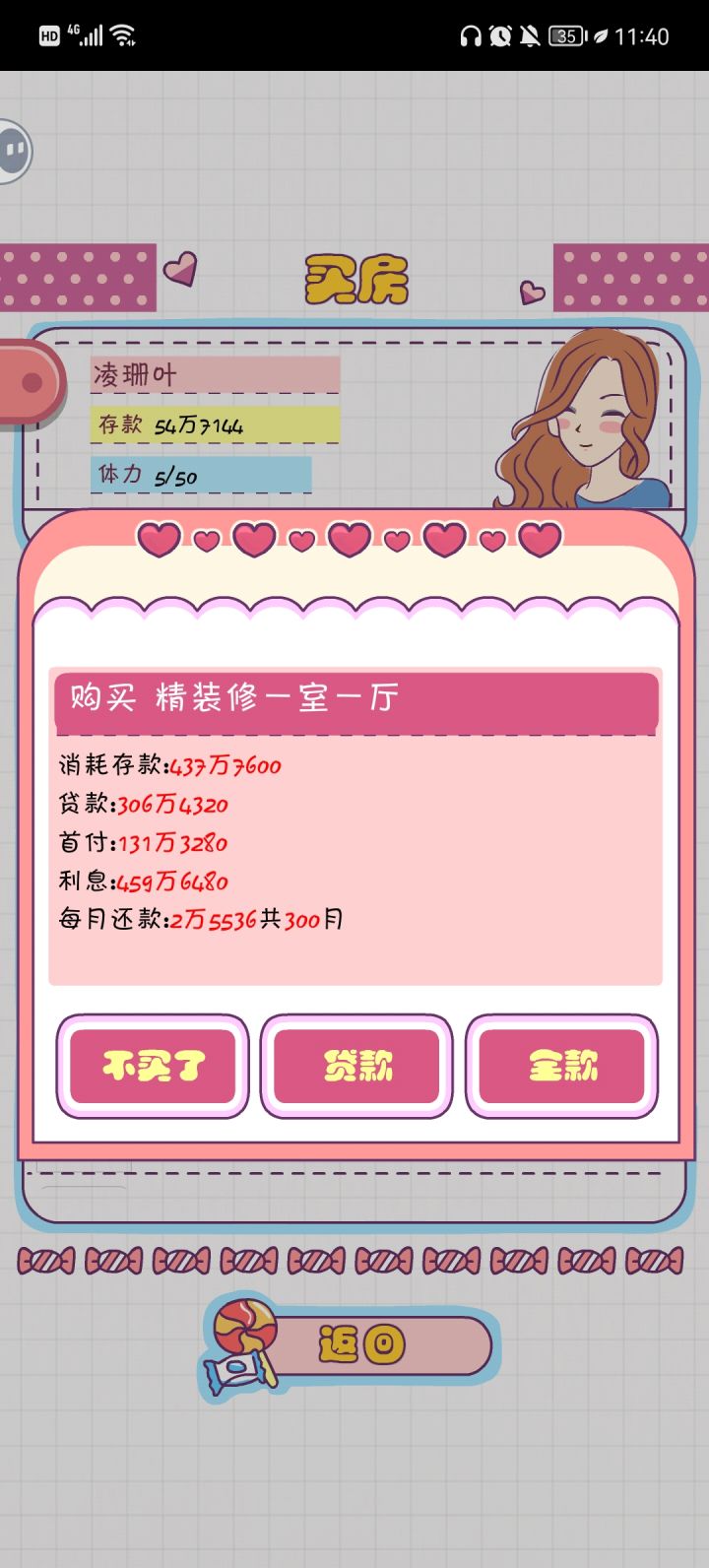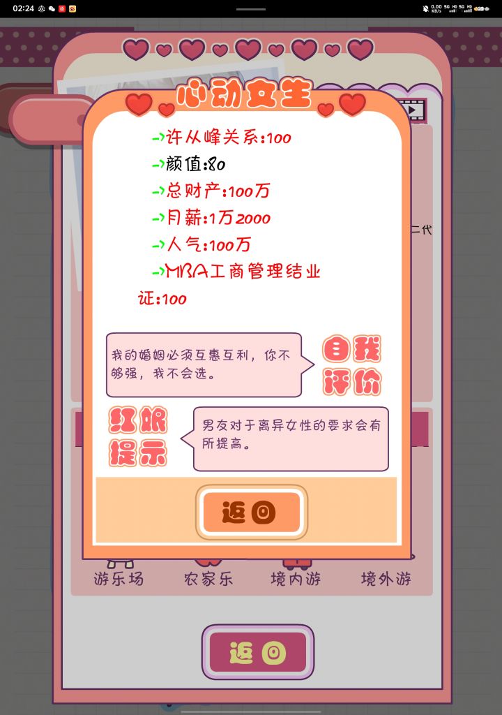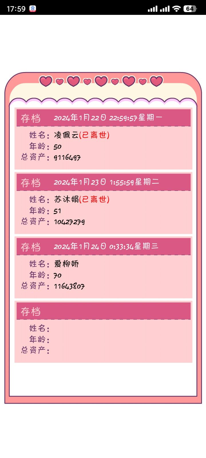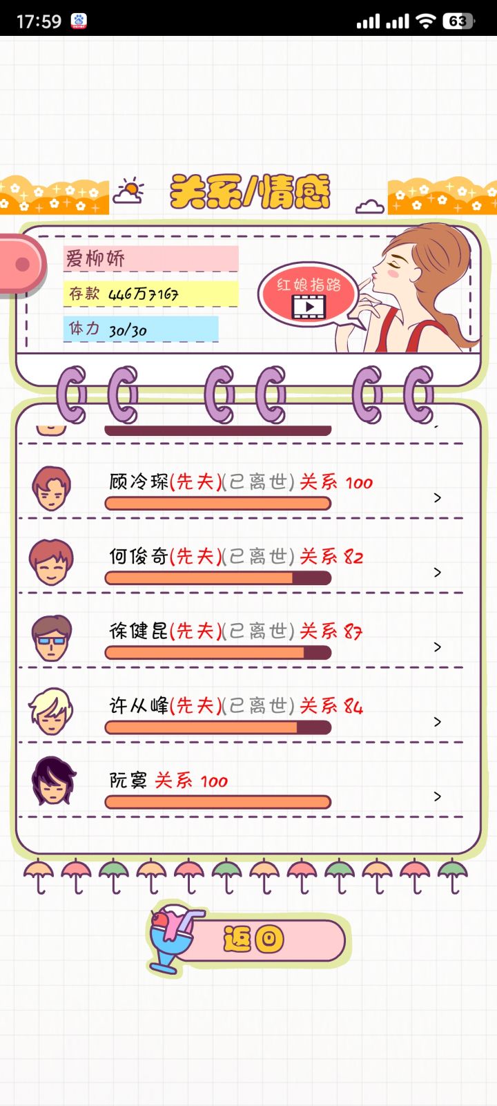玩了好几遍,把存档都玩完了,重新下载一个,再试试其他玩法。总的来说,如果只赚钱的话,好感度没这么重要,前期只刷一个人的好感(刘郁宁),不浪费体力值,保证心情(其他人都是只聊天,慢慢涨起来的)。