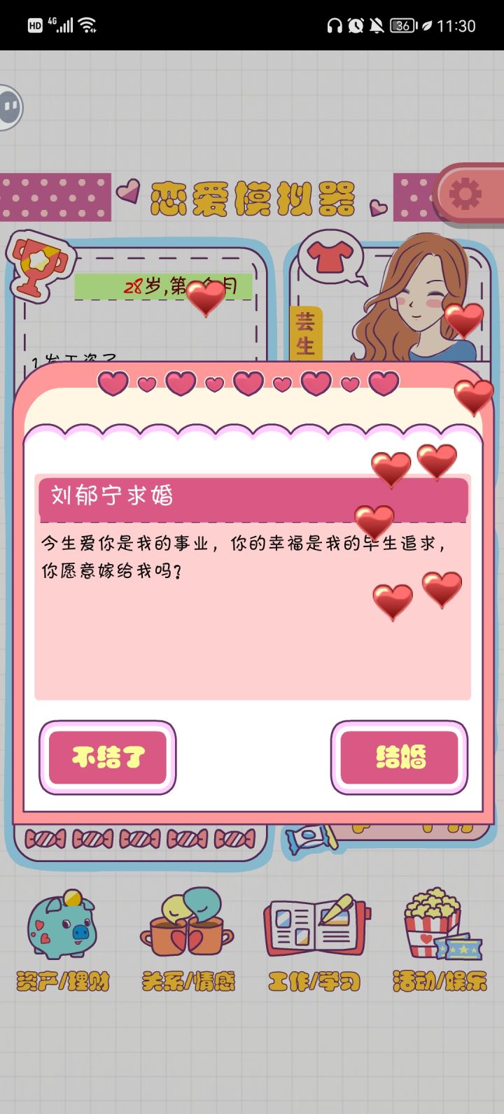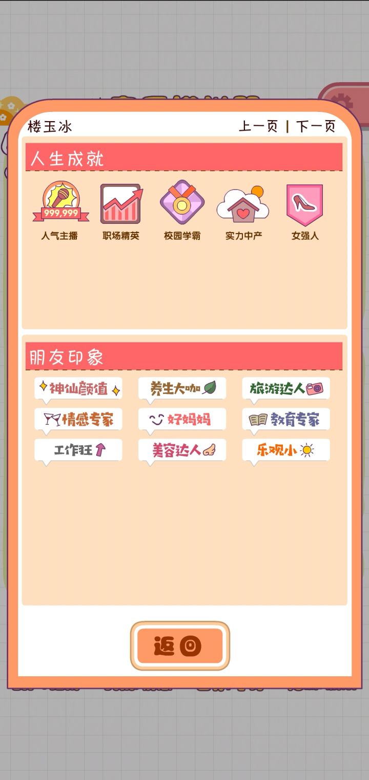 总的来说,感觉挺真实的,对于一个还没踏出社会的人来说,给我的感触还挺多的,就比如房奴的特性,还有就是,结婚之后孩子的那些事,孩子长大后要孝敬钱这些,都挺感触的还在读书期间找父母要零花钱最高也才900多,给他零花钱一给就是5000😶,还有就是幸福指数,结婚那一年最高,第二年直接掉半,这些,都挺真实的,真的是人生模拟器,最后附上一些图片。
