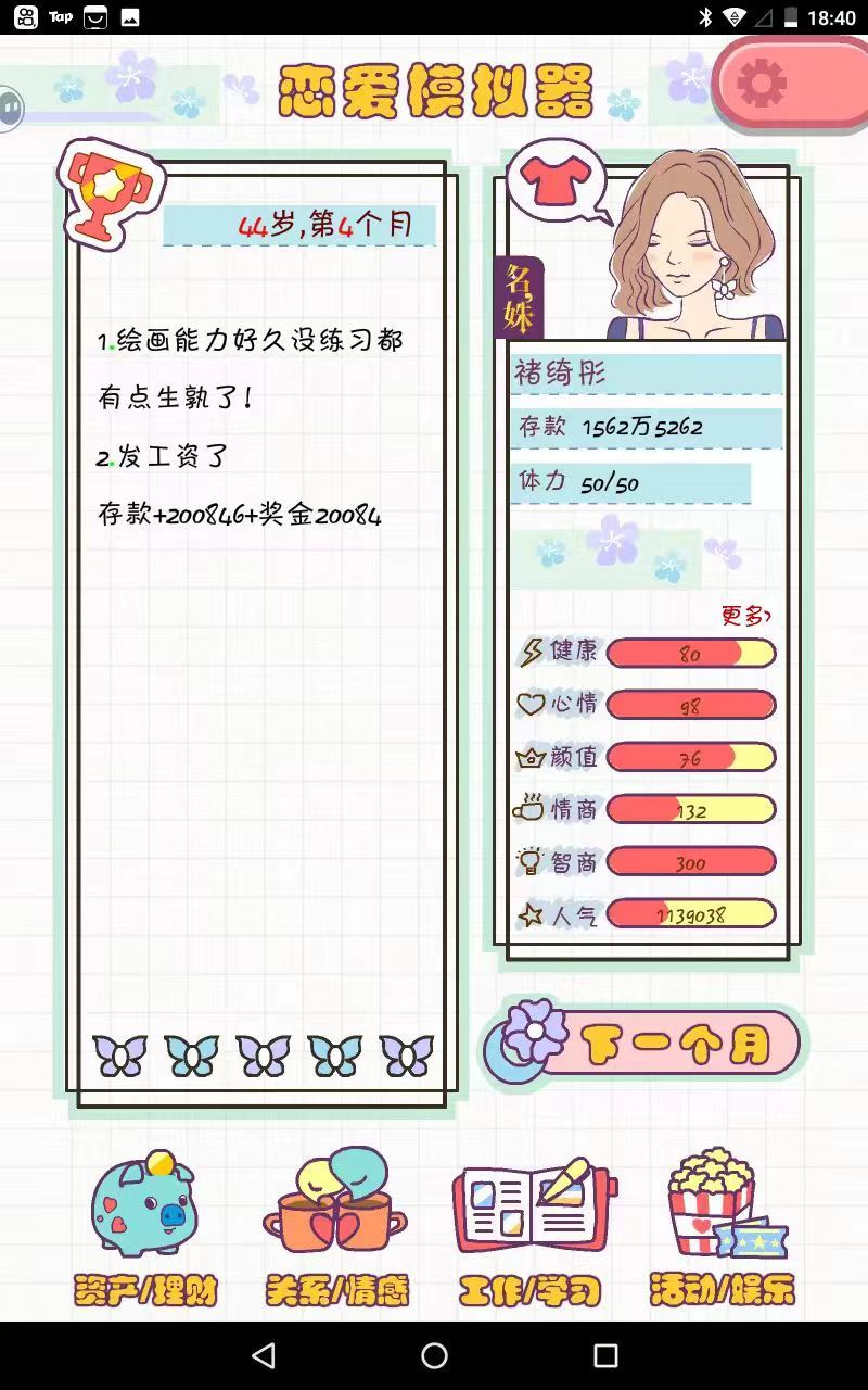 第一世: 19~22岁 不刷父母好感,但是每个月得死要钱,也不要蓝颜除了方沐晨,只刷婷婷的好感,因为重生后忘掉美貌,但是智商或者其他的才艺不会遗忘。 刷属性顺序↓ 智商60≥情商50≥表演500≥口才200≥绘画20≥ 说说属性在哪加↓ 智商(围棋社)情商(志愿者协会)表演(话剧社)口才(辩论会) 绘画(漫画社) 23岁后 这个期间也是死要钱,应聘贸易公司工作,每个月保底5000,然后每个月去考西
