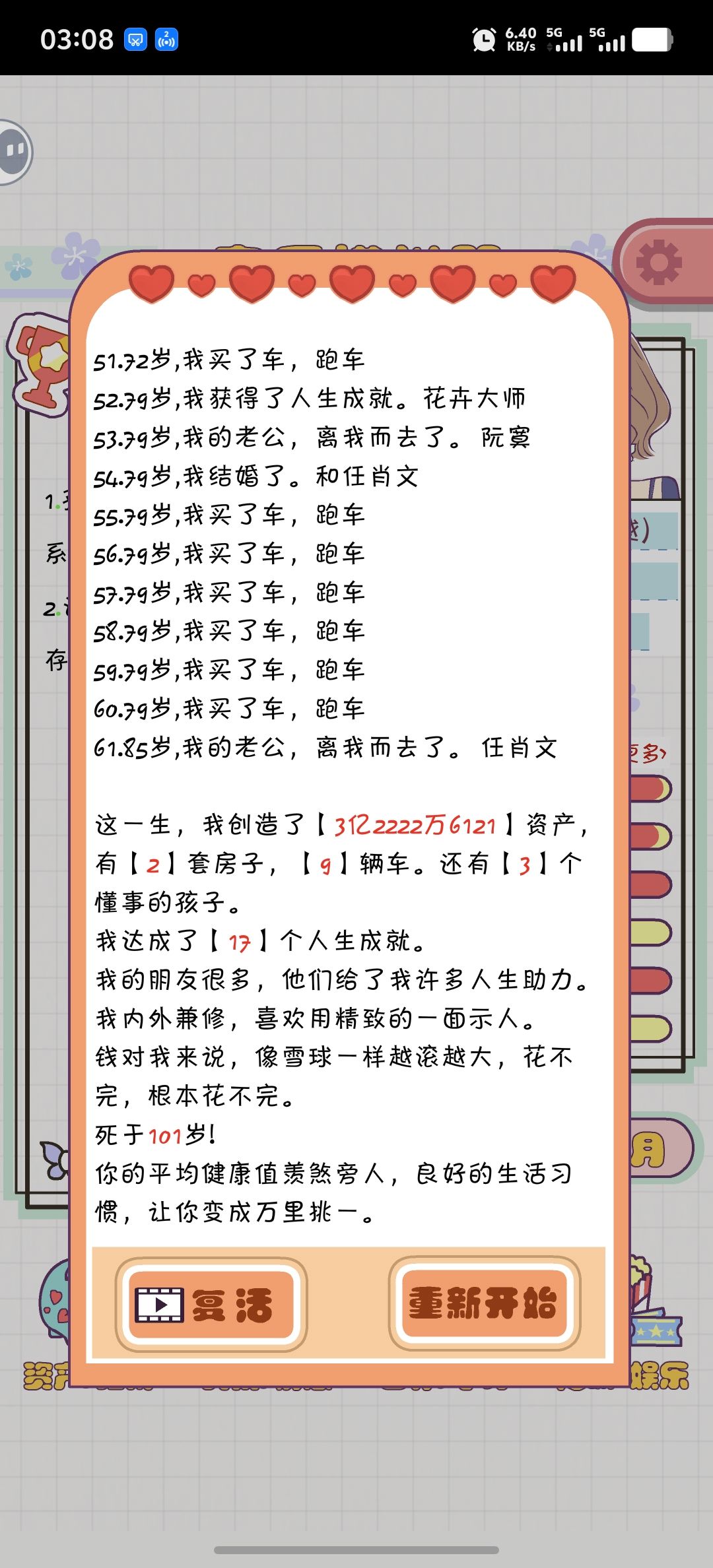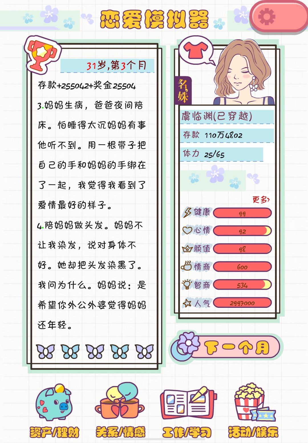 前期靠舔父母攒钱培训,刷口才、智力、情商等属性,中期靠舔老公(大十岁那个)攒钱,舔蓝颜攒礼物。 等律师工作薪水八万,三个孩子也挺大负担得起每年75*3=225的培养费用后,开名姝模式,用攒下来的礼物换声望(我攒了三百多个礼物换了三十几万的声望)。再去聊天群把能加的群都加了(先职场精英后创业翘楚),基本【娱乐-名姝派对】里可以一次刷三四五千+声望。 然后就是俗套的投资-赚钱-投资-赚钱模式,赔了就看