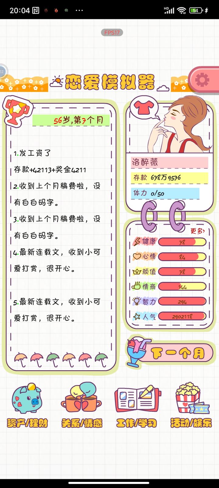 她从19岁开始你的大学生活,她好像只有女生没有男生的,玩了快两个小时我觉得还挺好玩的,开始和你父母的关系是很不好的是零。他有社团活动兼职工作还有考证的,但是体力蛮少的只有50,还有其他的娱乐活动都挺丰富。但是唯一让我遗憾的是她体力只有50,还有好多活动我都想参加可是都不行好难过,但是其他的都挺好的你可以去试一试感觉很像模拟人生一样。安利这款游戏哦!#我的游戏日记Vol.1#游戏推荐#游戏安利#恋爱模拟器