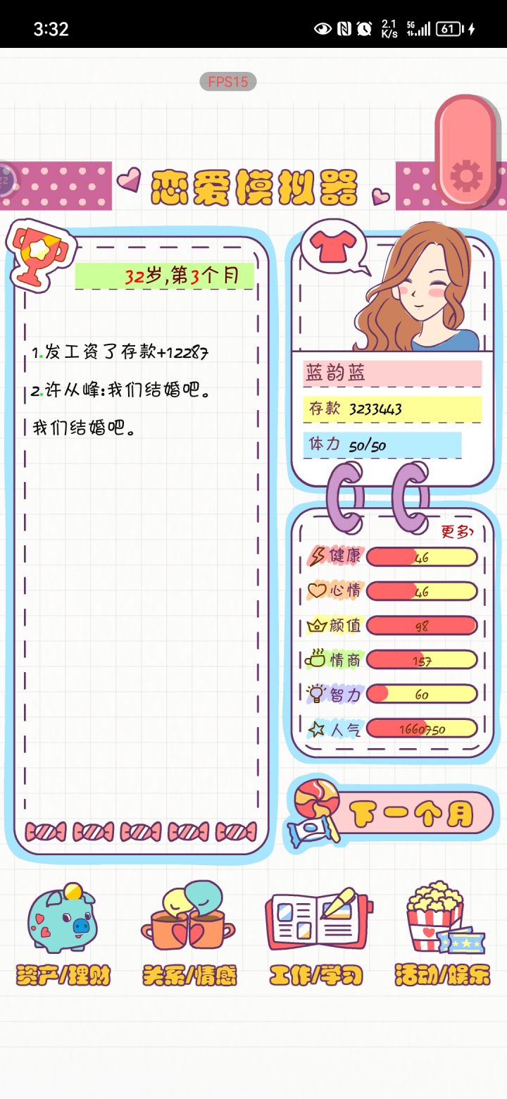 第一世:除了苏婷婷别的人都不搭理,也不陪父母(但是每个月零花钱得要),男人和另一个姐妹都不要,因为第二世会清空好感和礼物,所以第一世只认识一个苏婷婷就够了,省体力先去把表演能力拉满,口才拉到两百够用就行,主要表演没法在其他地方刷,剩下的体力在毕业前把情商刷到50,智商刷到60,毕业的时候花6000出去玩儿+10情商,然后可以去那个贸易公司工作。毕业前把绘画至少刷到20,方便毕业后做漫画投稿兼职。