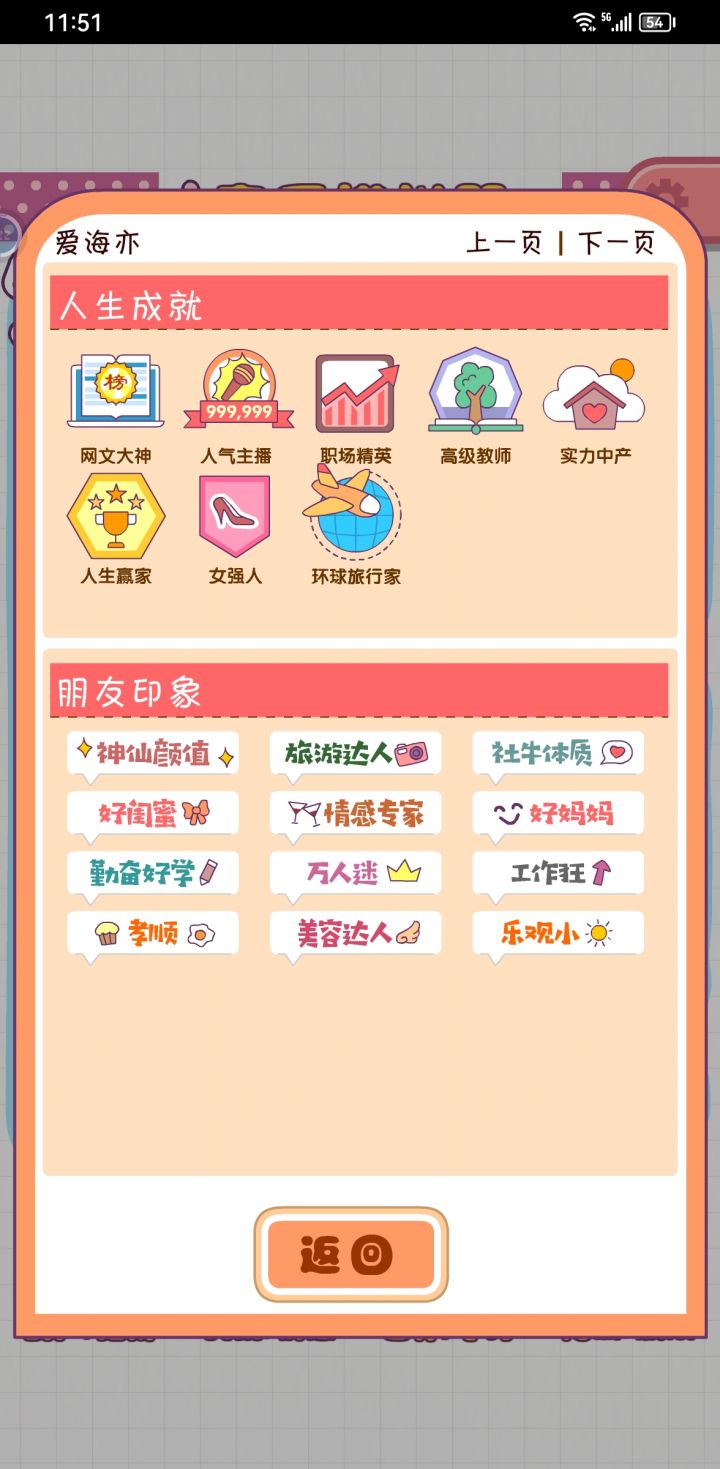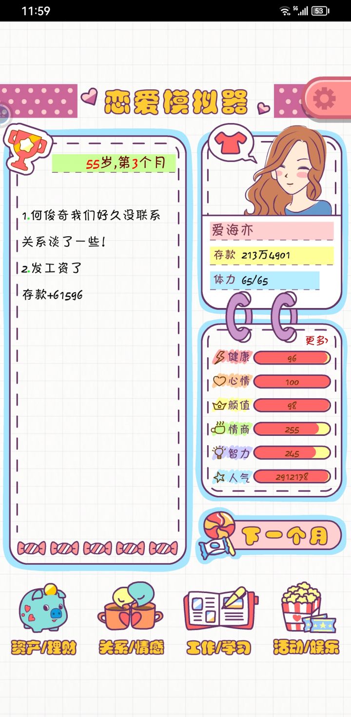 这是俺第二个档,第一个档玩到70岁有经验了,就来开了二档,这次咱们就是直接瞄准小许。以下是俺的小许攻略🏫上学的时候每个月找爸妈要零花钱攒钱,然后就狂刷话剧社加表演,偶尔参加围棋社和志愿者协会辅助加智商和情商。表演尽量刷到400+(毕业以后没机会加表演),智商和情商我都刷到了60+,为了毕业以后有个贸易公司职员的工作。(后来发现培训机构老师起始工资更高嗐)大学期间安慰失恋室友会结识苏婷婷、高中同