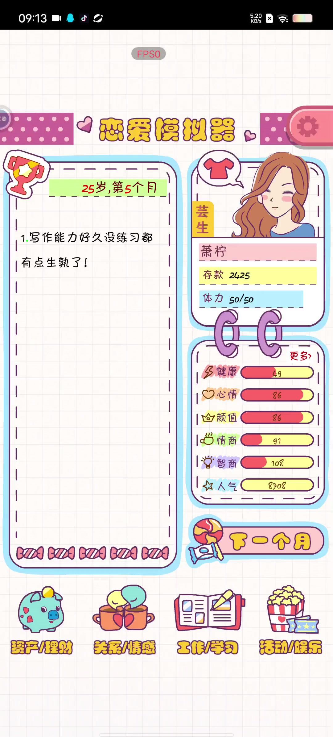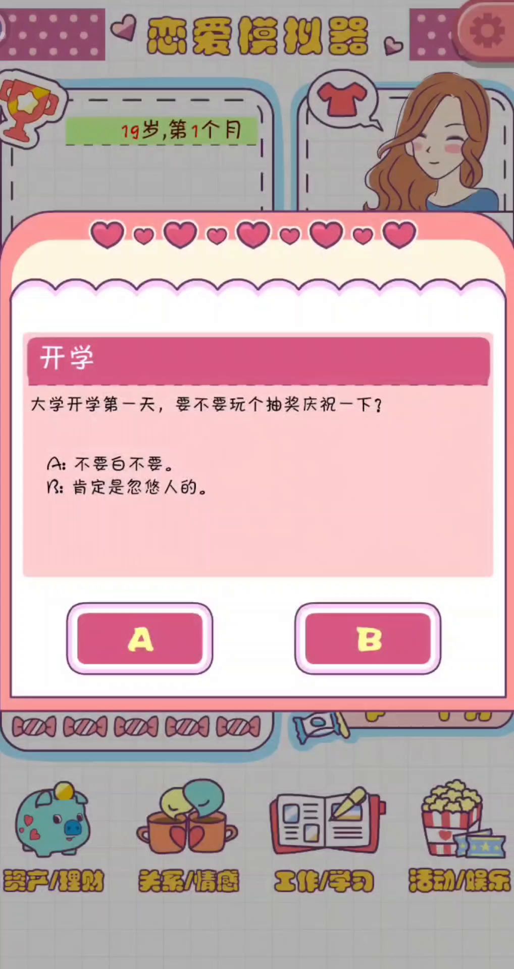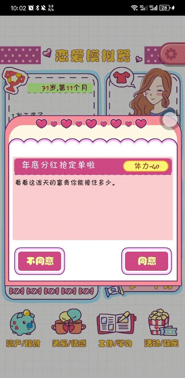 她从19岁开始你的大学生活,她好像只有女生没有男生的,玩了快两个小时我觉得还挺好玩的,开始和你父母的关系是很不好的是零。他有社团活动兼职工作还有考证的,但是体力蛮少的只有50,还有其他的娱乐活动都挺丰富。但是唯一让我遗憾的是她体力只有50,还有好多活动我都想参加可是都不行好难过,但是其他的都挺好的你可以去试一试感觉很像模拟人生一样。安利这款游戏哦!#我的游戏日记Vol.1#游戏推荐#游戏安利#恋爱模拟器