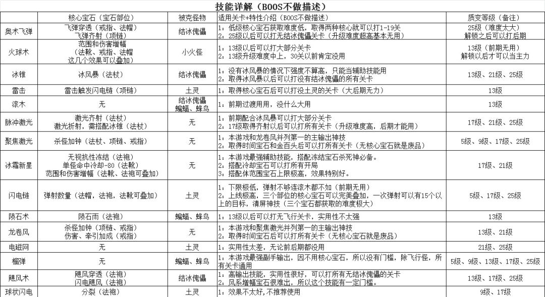 如有错误欢迎大家指正 图一为技能介绍 图二为局外升级简介 图三为局内升级顺序 开局:武器位置,奥术弹1-19关(可用冰锥+冰风暴替代) 前期:(20-35) 武器:冰锥/雷击(搭配核心宝石) 项链:龙卷风(贯穿游戏,搭配时间宝石) 戒指:榴弹(前期必备) 中期:(30-55关) 武器:雷击/飓风(红色及以上雷击链,没有就飓风) 项链:龙卷风(贯穿游戏,搭配时间宝石) 戒指:榴弹/冰霜新星 后期:(