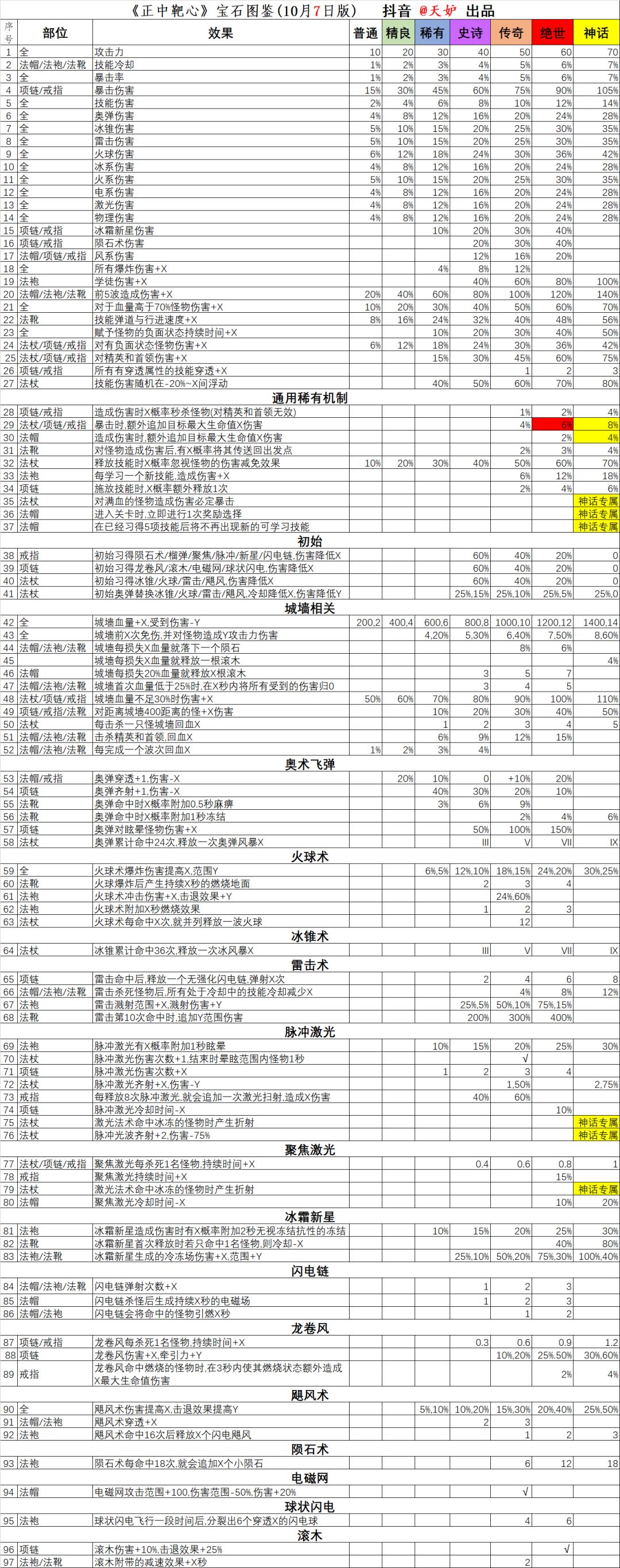 这个视频能给萌新(未来发展、宝石合成保留) 卡关老玩家、月卡党(卡关66、67)一些启发。 1800的面板通关70期待[表情_期待]期待[表情_期待] 神豪们可以忽略,毕竟充值就能解决问题 我自己这个小号氪了一千米左右 理论上只要脸白+更早期玩靶心 2800面板零氪也能通关(按照这个思路) 通关法术明细: 15级雷击 15级闪电链 17级冰霜 7级电磁网 核心宝石: 1、法帽 : 攻击附带