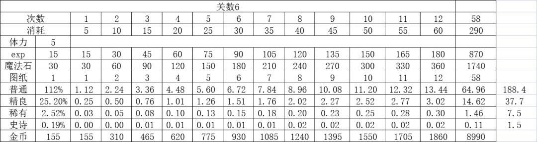 每十分钟1体力,邮件四个15体力,广告加宝石80体力,商城每天6体力,每天的体力总共能得290点。 从经验上来看每关获取的经验是一样的 魔法石从19关开始每关40个,第六关一天1740个,第12关一天1632个,第30关一天1640个,第35关和第30关一样,缺魔法石扫荡第6关 图纸从13关开始每关3个,第6关一天58个,第12关一天96个,第30关一天123个,第35关和第30关一样,缺图纸从1