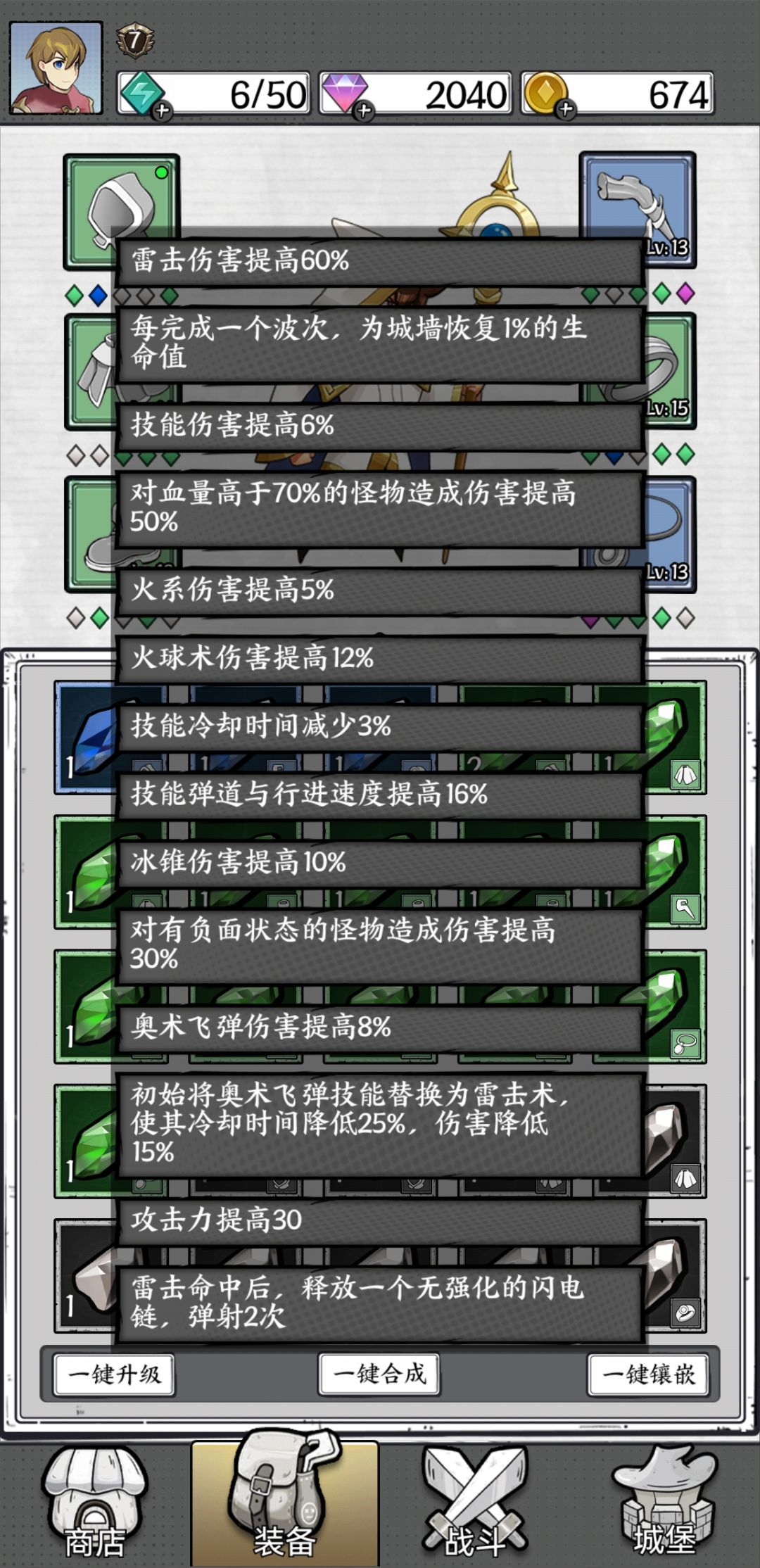 雷击链是过43之后自己洗出来,之前一直没有,说一下我的思路。 众所周知,这游戏局内每一关新学技能只要不歪都是巨大的提升,所以最难的是前几关,然后雷击在有雷击链之前最大的问题就是频率低,一旦4下清不掉一个怪,后续很容易被越堆越多的小怪摸掉城墙,所以我的思路是保证雷击伤害的基础上堆前5波伤害,25%血量无敌3秒,有条件的话加上低血量百分比加伤害,尽快成型技能,如果技能太歪干脆重来。 针对技能宝石,冰环