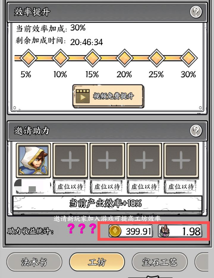 邀请助力后,工坊收取金币和石头,也只是正常收取啊,看金币总额,并没有得到助力产出的10%那部分奖励。所以问题来了,这助力收益,到底要怎样获取呢?😅