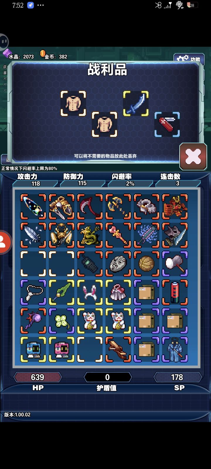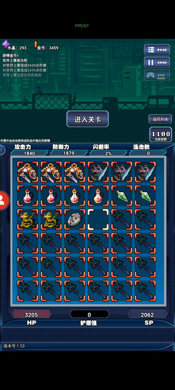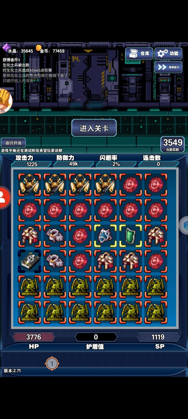 跟之前的冒险日记一样,想玩更新的必须加群,tap都不知道是多久之前的版本了。玩了两天四把,没有一把是死了的都是自己重开的,第一把tap玩的,电池太多卡合成格子看有人有仓库所以加群换了有仓库的版本,第二把电池一路秒到两千多层看群里说后期要闪避,卡格子转型难所以重开,第三把看群公告攻略玩的防战,被告知攻略不适合现版本(攻略中输出靠古董,现版本靠反伤)龙神雕像不用那么多(我个人认为龙神雕像前期就是越多越好但是懒得争辩了)且合成卡格子所以再次重开,图中是第四把,出现了前三把都同样出现过的情况,当你需要合成什么的时候必定一段时间缺一个位置的散件,其他位置的给你大量来,格子给你占满你一个都合不上(前期合成龙神雕像四叶草项链大量来不来中间的红装备无所谓,毕竟品质提升低红色不来正常,但是做强袭套装的时候我出现过一个情况就是强袭四件套其中三个没种六七个剩下一种就是不来),就像我最后这把盾甲需要的两个红色一个振金盾一个金盾,连着来了十一个振金盾格子给占满了一个金盾没有,说实话如果多两个三个甚至四五个五六个我都可能会觉得是运气问题,但是这尼玛十一个振金盾没有一个金盾?还有黑武,三千五百层共遇到六次黑武,其中三次钉头七箭书(效果唯一不重复生效所以多余的完全没用,且本身就可有可无),两次加闪避的翅膀(防战打反伤闪避就没伤害,所以也没用),一次加魔幻的蛋糕(吃防具加成魔幻基本没用)。我个人单从我自己的经历来看很难相信这不是故意设计成这样恶心人的。