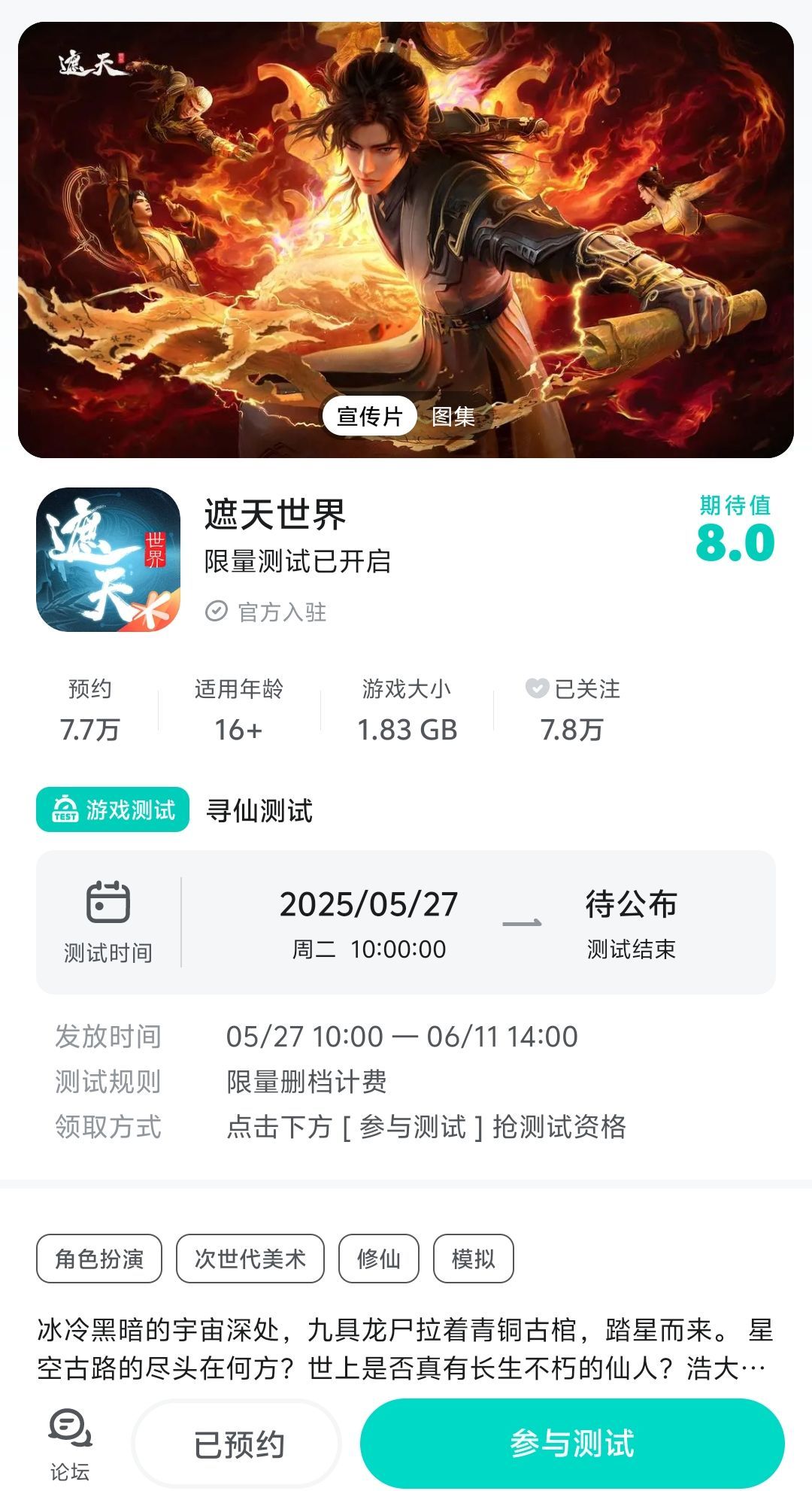 诸位道友周五好,这里是小天~感谢大家对我们的关注与期待! 国创动画《遮天》已于5月3日正式开播,由遮天IP正版授权改编的次世代国风修仙手游《遮天世界》也正式上线TapTap,开启游戏预约啦~ 在《遮天世界》中,我们致力为道友构建一个气势恢宏的修仙世界!在这里,不仅有高度还原的经典剧情,还将有无数的同道与你共踏登天路。 即便始于微末,但在狠人大帝的指点下,您将拥有自己的门派与世家,携手共战太古生物、