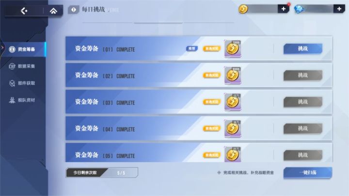 当指挥官的等级达到13级以后,在主菜单右下角的【日常副本-每日挑战】便会解锁。每日挑战共有4种不同的关卡(资金筹备、数据采集、部件获取、舰队资材),分别对应金币、机体战斗数据、部件、战舰战斗数据四种资源的获取。每种关卡每天最多可以挑战5次,其中前两次免费。每个难度的关卡在首次通关时都可获取大量的对应奖励,其后可以对已通关的关卡的最高难度使用“扫荡”功能,一键获取资源。*每日副本的额外购买次数