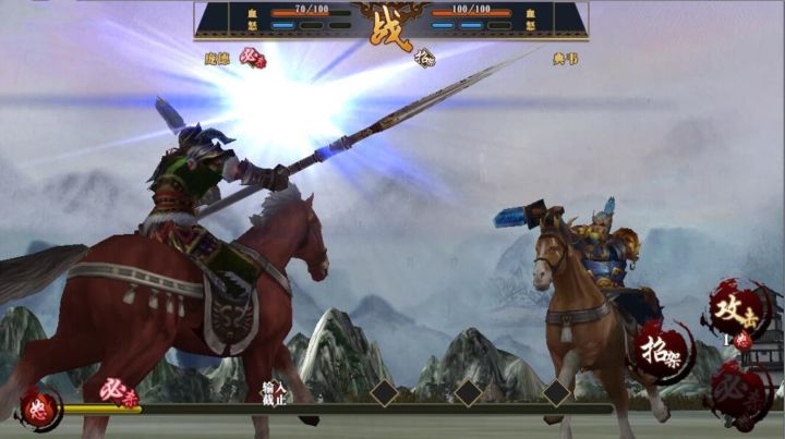 乱世争霸,除了两军对垒激情厮杀外,也有单枪匹马生死决战的武侠桥段,两军阵前大将单挑也是常有的事。游戏的单挑体系是基于光荣《三国志》系列的简化,回归最原始的石头剪刀布的猜拳游戏,武将的行动指令只有“攻击”,“招架”,“必杀”三种。 单挑开始后,玩家可以自由输入五次行动指令,或者任由系统自行决定。双方武将的行动进行到特定时间点后进行指令的比较,根据“攻击”克“招架”,“招架”克“必杀”,“必杀”克
