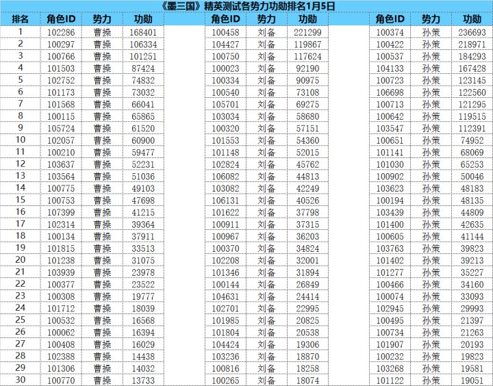 为方便大家查看功勋榜单,精英测试期间每日功勋榜单将在该帖下上传.游戏百科:国战1. 参与国战可获得请酒令,武将邀请函,酒,元宝,贡献,声望等丰厚奖励.第一名额外获得讨伐令,有资格向其它城池发起国战!2. 拥有讨伐令的玩家,可开启国战,国战只能在相邻的敌对城池才能开启,需满足讨伐的兵力和粮草要求。为保证测试期间玩法体验,若势力在凌晨仍旧未开启国战,官方将开启次日国战.