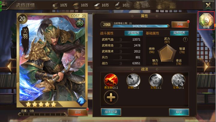 三国之所以深受广大人民的喜爱,其中一个最重要的原因就是其中错综复杂的人物关系,丝丝入扣的故事情节,《墨三国》的策划大大经过潜心专研,即将在新版本中对原有的羁绊系统——命缘做了更完善的优化!命缘系统将真实还原三国故事中的人物关系,收集相关武将可获得属性的加成哦~让我们先睹为快吧!在新版本中,各位主公点开武将信息可以在图片的右上角看到全新羁绊系统——命缘的入口。命缘界面清楚的展示了与当前武将所有存在