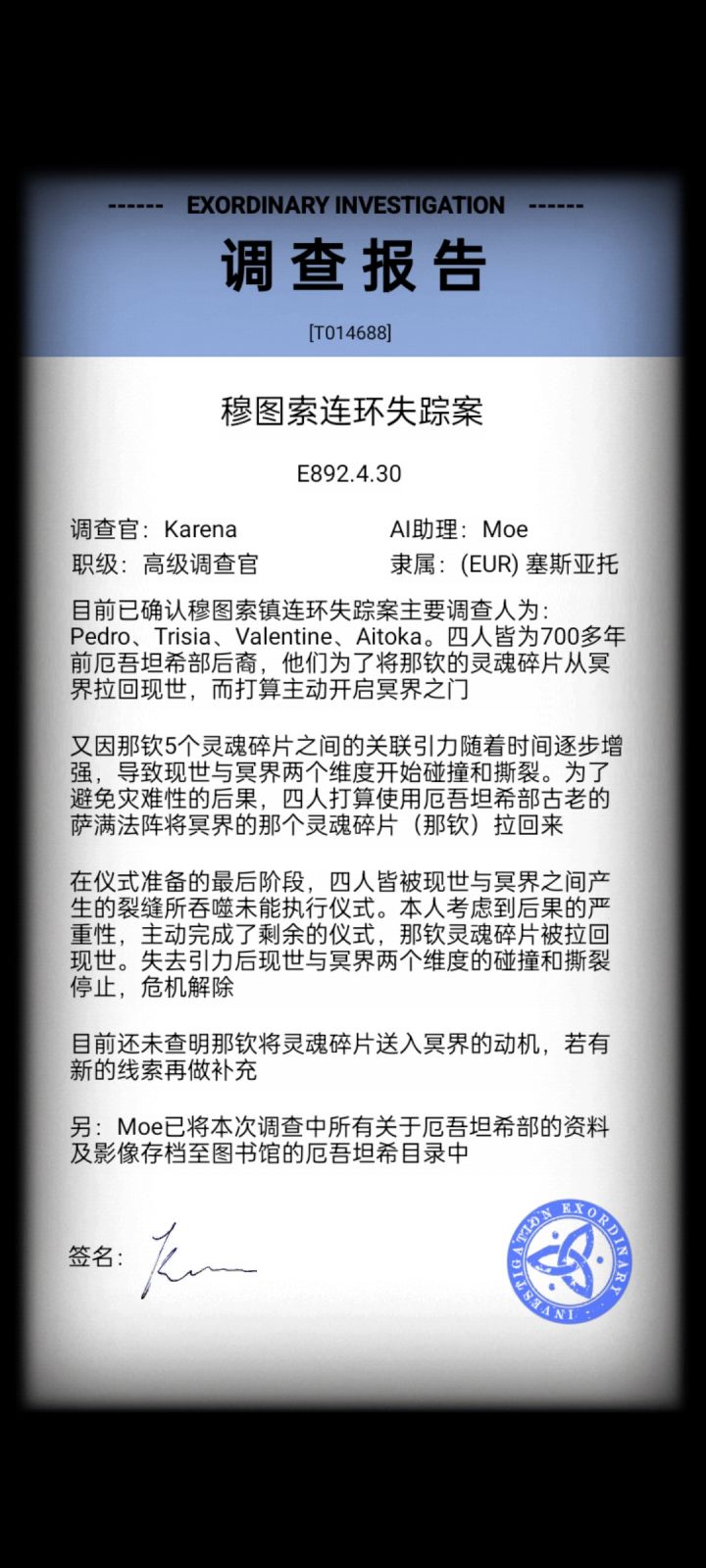 四位失踪者,皆为700多年前厄吾坦希部后裔,为了避免现世与冥界两个维度因碰撞撕裂而毁灭,想利用萨满法阵将冥界的灵魂碎片拉回,但很不幸失败反被吞噬,现在就由我们挑起大梁,完成剩下意识,化为危机!