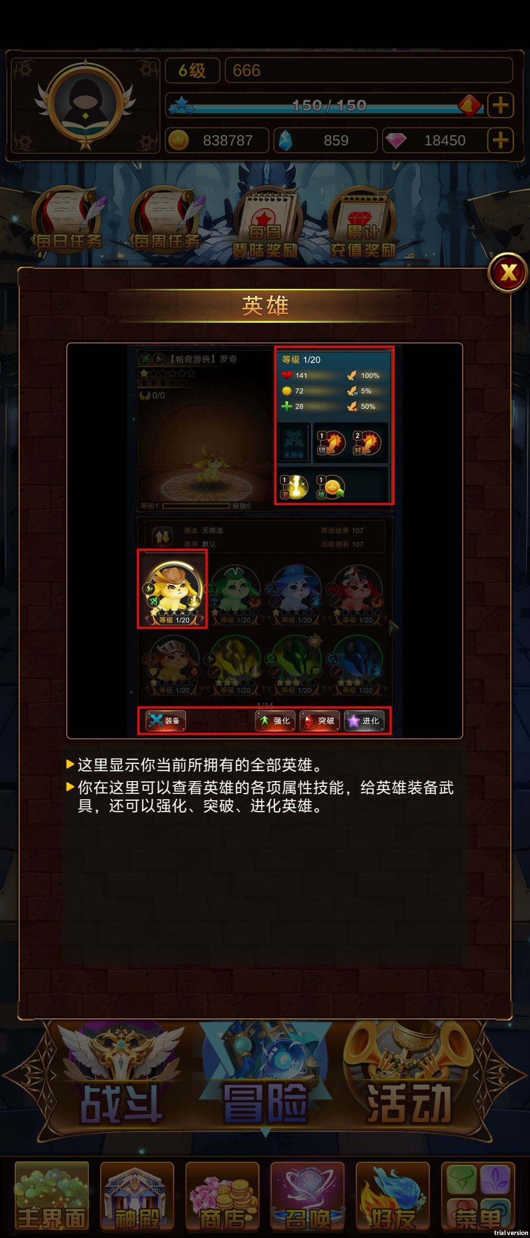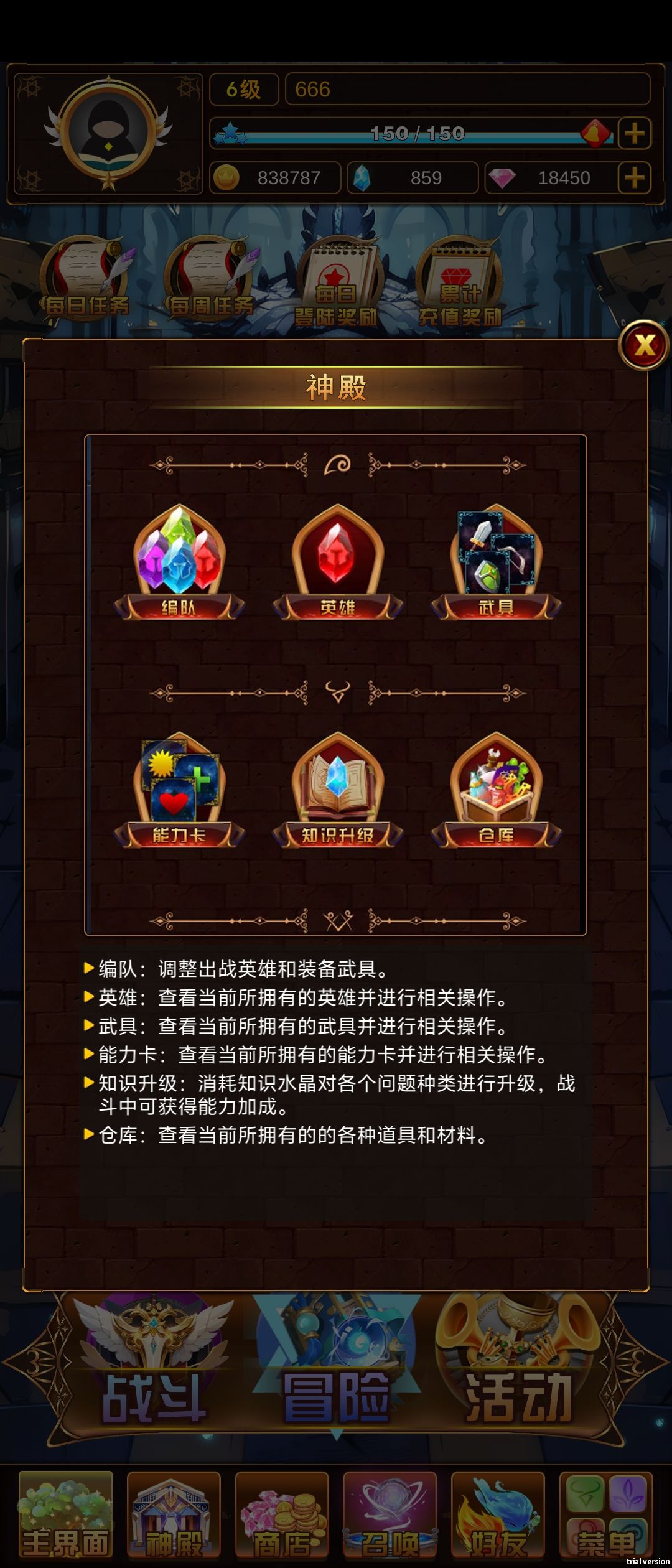 #问答英雄 #游戏攻略 《问答英雄》的系统功能包括:神殿、商店、仓库、召唤、金印、好友 神殿:查看所有英雄和装备。 商店:购买道具和材料。 仓库:查看所有道具和材料。 召唤:获得新英雄和武具。 金印:自动生产金币。 好友:支持好友助战,好友聊天,消耗友情点可兑换道具宝箱。