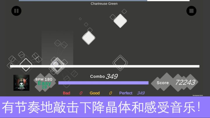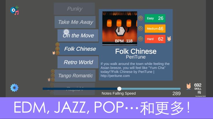 每个音乐都有自己的三个难度级别播放(简单,中等和困难)。初学者,节奏游戏有经验的球员,每个人都将能享受到游戏。