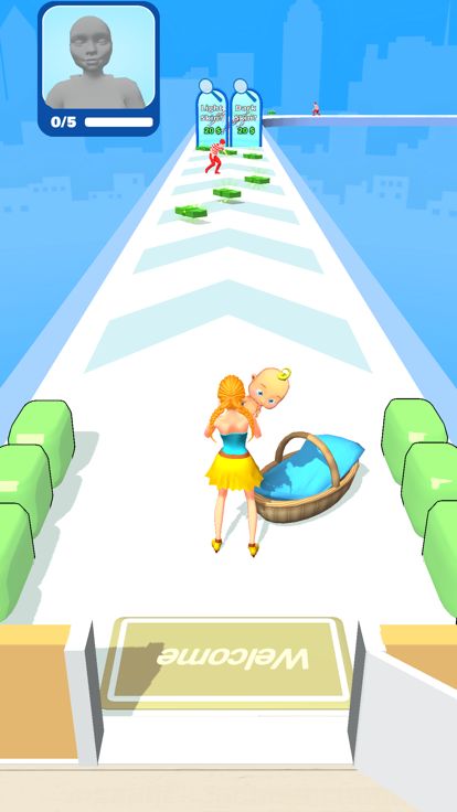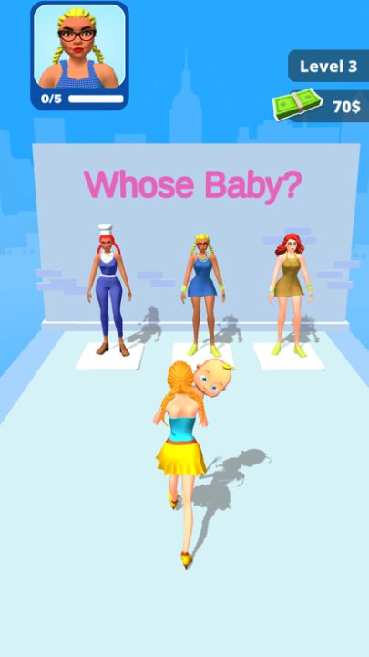 Whose baby? Collect money and buy hints to find the parents of the baby.