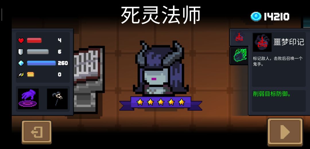 死灵法师:4血,6盾,260能量,0暴击概率 天赋技能紫手,死灵法师自带的唯一保命能力。 一技能:噩梦印记,对自己面前最近的一个敌人释放印记,印记持续时间为十秒。在印记持续效果内,所有个体对被标记目标的伤害加二。 目标在被标记的时间内死亡,可以召唤出一个鬼手。鬼手可以视作死灵法师的随从,有血量,血量被消耗光后自动消散。 可以跟随死灵法师15秒左右。 鬼手的攻击伤害6,受宠物加强天赋影响。死灵法师一
