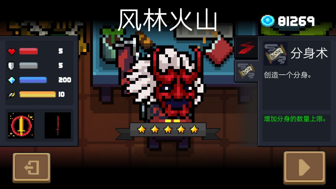 [米奇妙妙公司] (前言:第一次认真写攻略帖,不喜勿喷) 面板属性: 血量——4+1点 盾量——4+1点 蓝量——180+20点 暴击率——10点 初始天赋——近战反弹 技能介绍(二技能):召唤一个影分身,影分身复制自己手上的武器,血量较少,蓝量上限不明,四星升级至五星后,可以增加影分身数量上限 影分身优点—— 1.武器拥有配件效果 2.会继承自己的天赋 3.相当于不耗蓝的幻影法杖 影分身缺点——