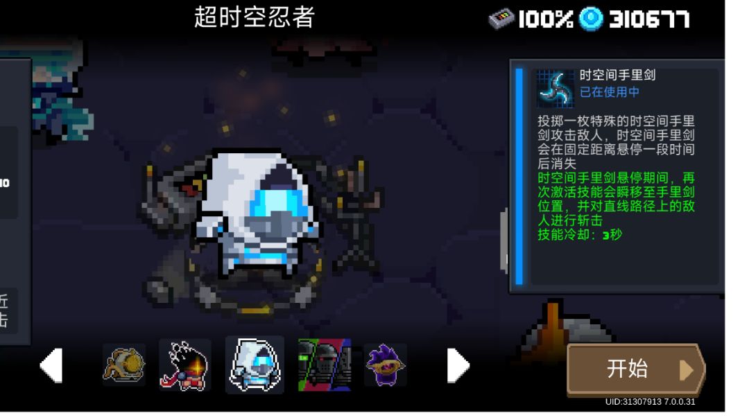 看了某大佬的视频,入了超时空忍者的坑。 强不强是一方面,主要是帅。 被动6秒左右一个,造成范围伤害的同时自身处于无敌状态,大概1秒左右,好像要短一点。被动可用于范围清怪或者保命。 技能3秒一个。1段扔飞镖,能清弹幕能穿墙,对路径上的敌人造成撞击伤害,原地旋转时对触碰的目标造成持续伤害;技能2段,自身斩击过去,斩击过程无敌,如果暴击可眩晕目标。 首先技能放的方向需要特别注意,往怪多的地方丢配合被动清