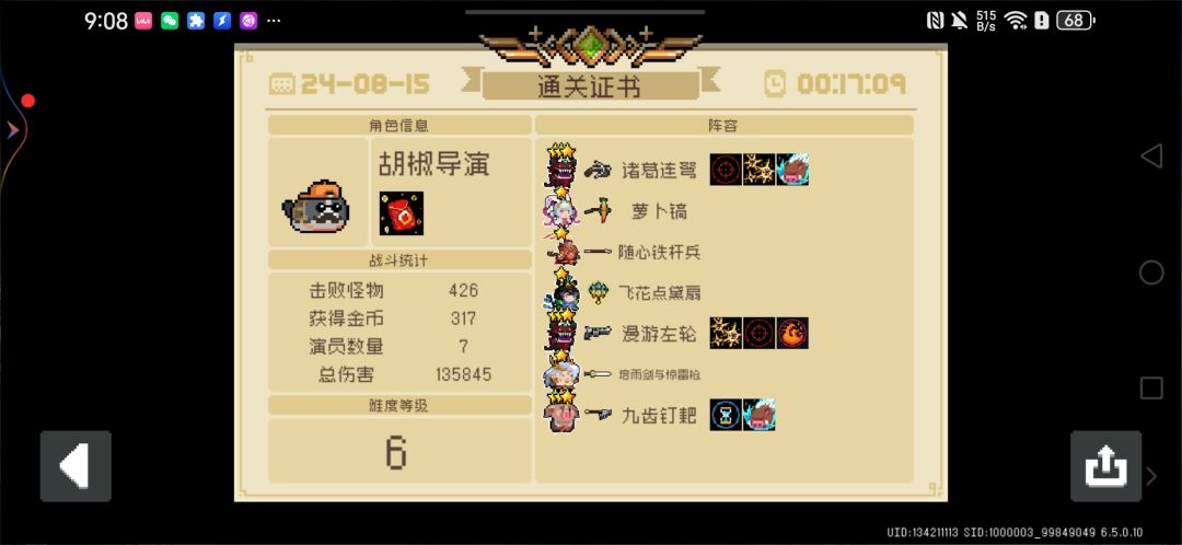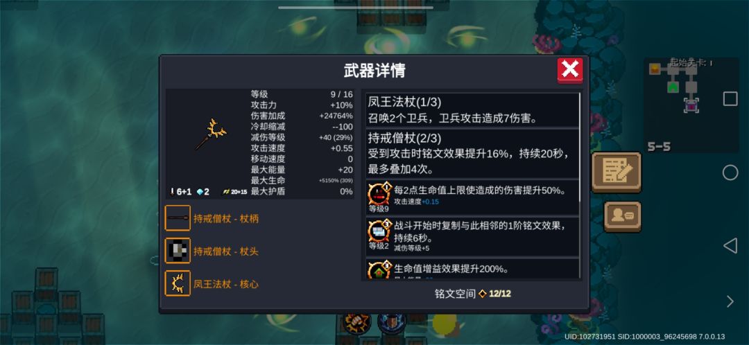 5个猴王必要组件 天赋 金币换血上限 铭文 生命上限换伤害 铭文 复制铭文(复制生命换伤害) 铭文 增加生命加成 铭文 持戒僧杖 武器就初始武器,在家里挂几张刮刮乐(建议去厨师那刷个好运气因子,金币刮到420以上),1-1直接把武器拉到金色 铭文升级优先把生命上限加成和生命加成换伤害拉到10级,然后拉持戒僧杖的级别(升级一次300,多的神器灰烬拉生命换伤害的等级) 开BOSS前先把3次僧杖buff
