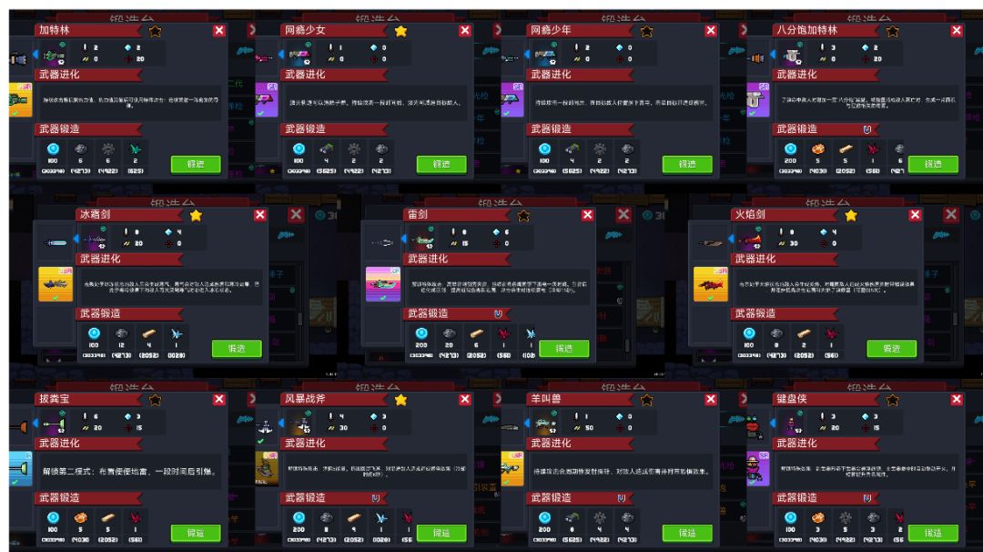 测试版本:先行服6.5.1 可养成武器15种: 雪狐 地下水 弓 激光鱼 火箭筒 大雪狐 强力分裂者 巫师法杖 巨巨雪狐 火焰战斧 花言巧语 骑士之拳 超级散弹枪 玄冥 晶蟹钛刀 模组9种: 变形加速器/刃之心/异常增幅器/零度结晶/冰火爆核 密林疾行者/省节能/毒气攻心/反弹护盾#宝藏游戏安利派对