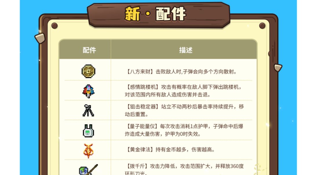 一定要记得看额外补充区(放在评论区,因为懒得修稿)。 ——……——……——……——……——……——…… 【八方来财】击败敌人时,子弹会向多个方向散射。 实战中可以有效削减群怪血量和收割残血敌人,搭配【子弹反弹】子弹弹弹乐了。 感觉品质可以提升,符合紫色武器配件品质预期。 ——……——……——……——……——……——…… 【感情跳楼机】攻击有概率在敌人脚下弹出跳楼机,对该范围内所有敌人造成伤害并击退