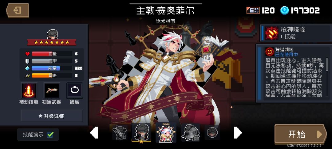 评论区有补充评论,看完帖子觉得还不错,可以再看看那个。 强度证明和个人对人物的想法。 单人裸通dzt还是非常轻松的(如果玩不好,可多玩玩【机器人】三技能消除弹幕),需要有一定练习的一个人物。高爆发,瞬间无敌,加速隐身,等待时机战场爆发,需要自己对怪物有合理的距离把控。 个人认为强度在t0上游~t1中游(有【导师】和没【导师】强化那就是两个人物)。 人物介绍 初始武器 近战武器,伤害8点,蓄力可三段