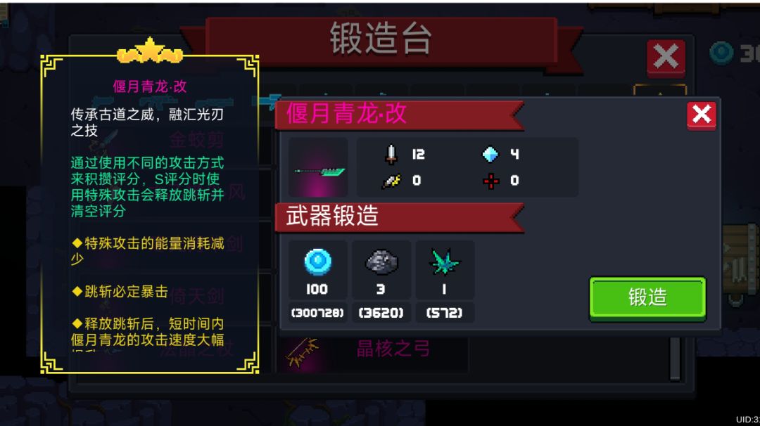 评论区有补充评论,看完帖子觉得还不错,可以再看看那个。 武器展示 武器介绍 传承古道之威,融汇光刃之技。 武器基础技能和词条介绍 通过使用不同的攻击方式来积攒评分,S评分时使用特殊攻击会释放跳斩并清空评分。 1.特殊攻击的能量消耗减少。 2.跳斩必定暴击。 3.释放跳斩后,短时间内偃月青龙的攻击速度大幅提升。 武器解析和个人对武器的想法 刀剑类型武器,每刀伤害12点,特殊按键每刀伤害10点,a技a