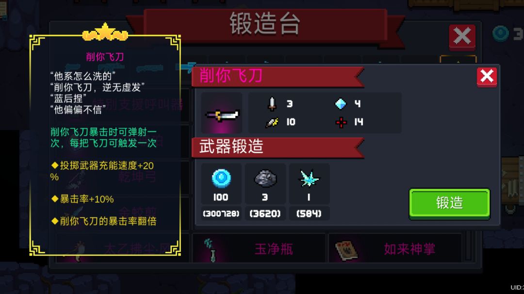 评论区有补充评论,看完帖子觉得还不错,可以再看看那个。 武器展示 武器介绍 “他系怎么洗的” “削你飞刀,逆无虚发” “蓝后捏” “他偏偏不信” 武器基础技能和词条介绍 削你飞刀暴击时可弹射一次,每把飞刀可触发一次。 3.投掷武器充能速度+20%。 2.暴击率+10%。 3.削你飞刀的暴击率翻倍。 武器解析和个人对武器的想法 投掷类型武器,射出四把无形飞刀,每把飞刀伤害3点,暴击可弹射一次目标,每