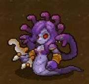 骷髅关boss,发射毒箭和追踪蛇头弹幕,击中玩家造成剧毒伤害,半血后会释放美杜莎的凝视,美杜莎停止移动,眼睛变为绿色,在美杜莎前方出现红色扇形区间,持续1秒后红色区间变绿,若玩家处于绿色区间则会受到3点伤害并被石化,石化时不能攻击和移动,石化时间为2秒