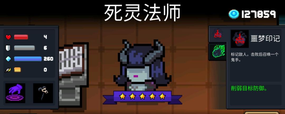 元气骑士中,死灵法师的技能分为主动技能和被动技能,主动技能分别是“噩梦印记”和“灾祸之石”,这两个技能的效果分别是“召唤”和“诅咒”,而被动技能的效果是降低敌人的子弹速度,并且提升自身拾取金币和能量球的范围。 主动技能-噩梦印记 效果是范围性的诅咒敌人,被诅咒的敌人,身上会有一个Debuff,在Debuff的持续时间内,将该名敌人击杀,就会召唤出一个“鬼手”作为自身的帮手。 主动技能-灾祸之石 效