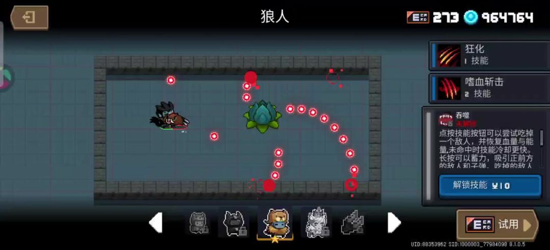 首先,角色本身10RMB(iOS端12RMB),三技能也是10RMB(iOS端12RMB)。技能冷却时间为3.5秒(之前好像是6秒?) 其次,最大吞噬层数为:10层(叠满后,角色体型也就有点大、攻速有点快、血量有点多、技能叠一定层数后有伤害减免“而已”)。新版本的狼三虽然跟以前一样,一次技能至多吞噬一名敌人,但是可以造成10点的小范围伤害。需要注意的是,隔着墙体对敌人使用技能时,无论是否在战斗或非