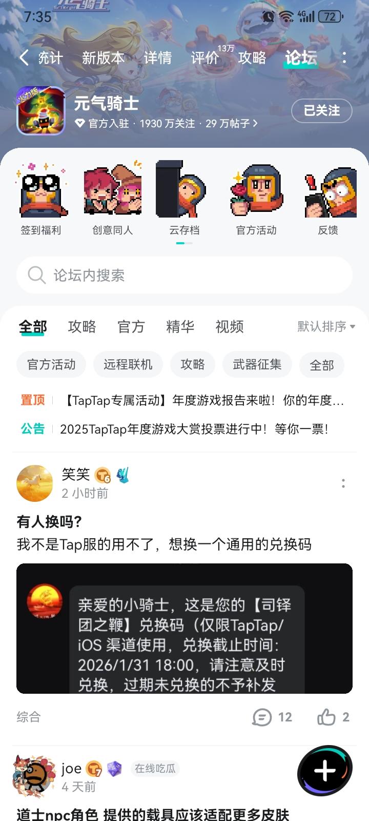 Hi小骑士!爆料人发现TapTap2025年的年度游戏报告已经新鲜出炉啦!《元气骑士》有没在你们的游戏报告中荣誉上榜嘞?如果答案是肯定的,请一定不吝分享!爆料人希望与你一同见证这份热爱ヾ(≧∇≦*)ゝ*将TapTap更新至最新版本后,在《元气骑士》论坛置顶内容处即可点击查看年度游戏报告哦!截图任意2025年TapTap年度游戏报告中有《元气骑士》游戏出现的页面,打上个人水印后分享至本帖评