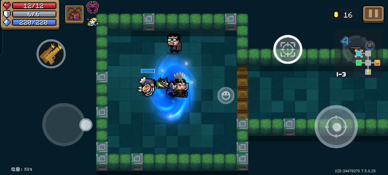 有bug啊,这里我是拿了樱花散弹枪(漏洞是走路滑滑的那个)然后换的第五代冲锋枪,点了三次散弹天赋,拿樱花散弹枪战斗玩后只要点屏幕轮盘就会动,到后面什么都点不了只有轮盘能动。传送门也显示不出来,点不了,连暂停都暂停不了那种。 #元气骑士