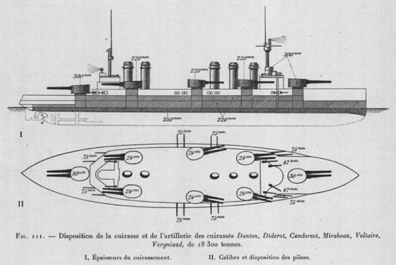 其实就是中文wiki的东西,出生就过时的前无畏 丹东号战列舰于1906年2月在布雷斯特兵工厂铺设龙骨,1909年7月4日时下水;经过5年多的建造后,直至1911年6月1日才服役于法国海军。本舰全长146.6米、舰宽25.8米、最大载重下吃水深度为9.2米、满载排水量19,736公吨(19,424长吨;21,755短吨)、舰上可容纳681名人员;其推进系统由4组帕森式蒸汽涡轮发动机与26台贝尔维尔(