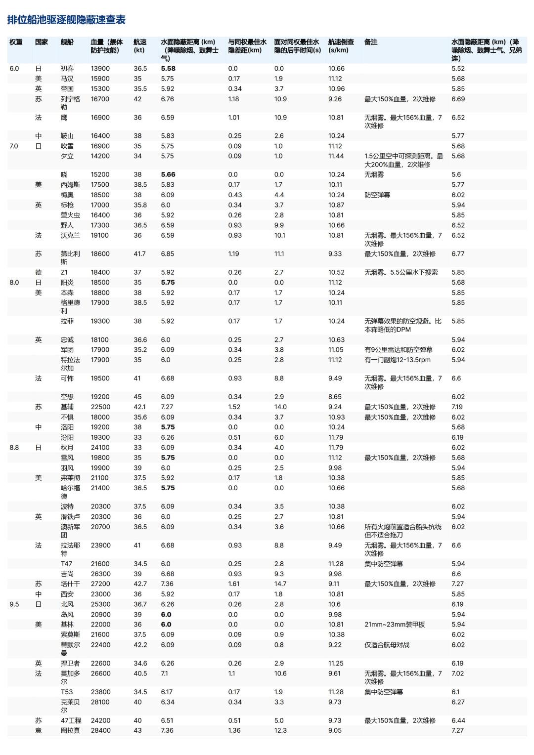 如题,涵盖排位船池内所有驱逐的部分指标。考虑到目标受众为驱逐玩家,船员技能已经默认你点亮了舰体防护和鼓舞士气,对于点了兄弟连的玩家还可以参照最后一列。 “面对同权最佳水隐的后手时间(s)”可以理解为面对该权重隐蔽最好的驱逐时,假设对方不动,我方满航速“撞亮”所需时间。地图尺寸为长度参考系下,舰船航速与实际速度的缩放比参考 https://www.taptap.cn/moment/277788932