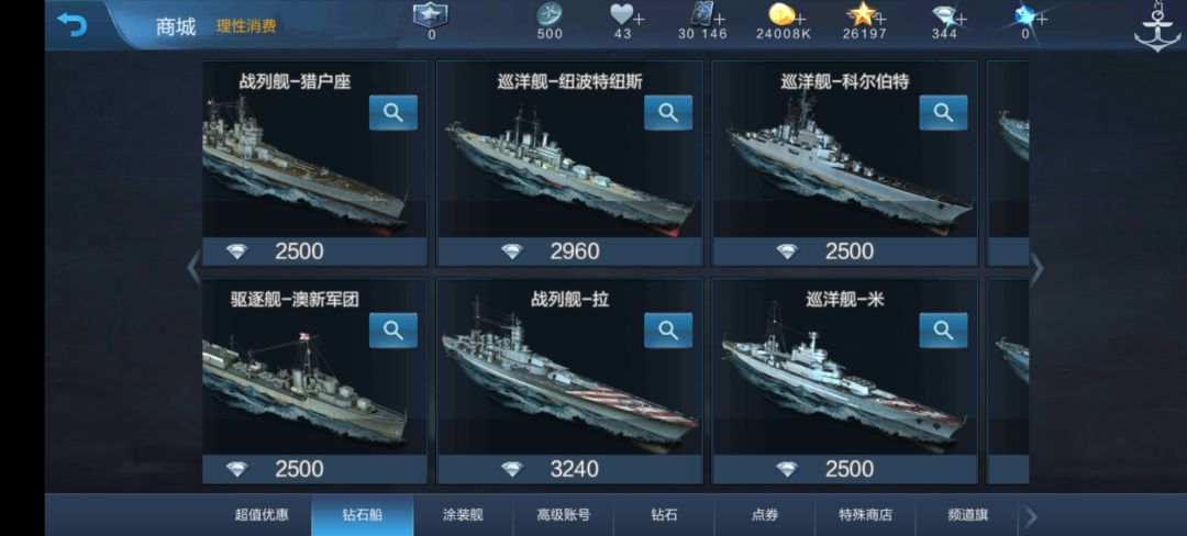 钻石商店推荐: 巡洋舰:米开朗基罗,科尔伯特 战列舰:苏白(斯拉瓦),拉斐尔##战舰联盟