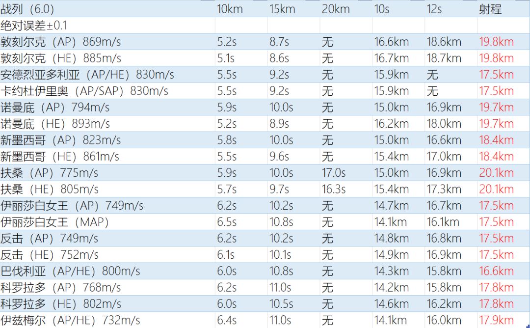 6.0所有战列舰的弹速射程与落点时间