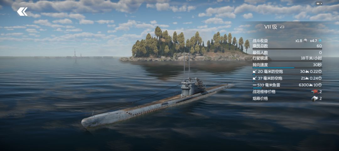 官方的答复是没有考虑。 不过在讨论潜艇不可能出的原因之前,先来看看另一个游戏里的潜艇 对的,隔壁战争雷霆....手游 战雷倒是真的给出了潜艇 先介绍一下设定吧(以德系II级潜艇VII为例)(满配,装备航速插,声呐插,水雷) 航速: 位于水面/潜望镜深度时拥有巡洋级别的航速(30节),可以跟随大部队快速前往交战区域 位于水下时只有9节航速,近距离面对各舰的反潜深弹则只能快速回港了。 隐蔽: 位于水面