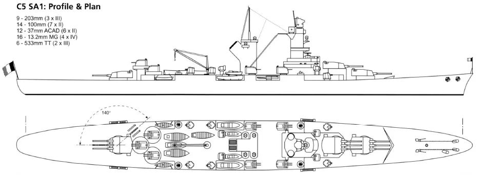 续写上篇文章(中期的法系CA,阿尔及利亚号+C5A3方案) C5方案重巡,是为了应对德系新重巡,之前的重巡,可以应对意系重巡 C5重巡的更强配置 C5SA1方案 C5SA1方案配备更强的副炮和防空火力,但是相应的,却没有水上飞机能力,后世经过判断的C5SA1方案,弹药库偏多,可能会更加危险 C5SA1方案,注意数量较多的高射炮,SA1方案的设计吨位相比A3方案较大,达到了12070吨,其它属性基
