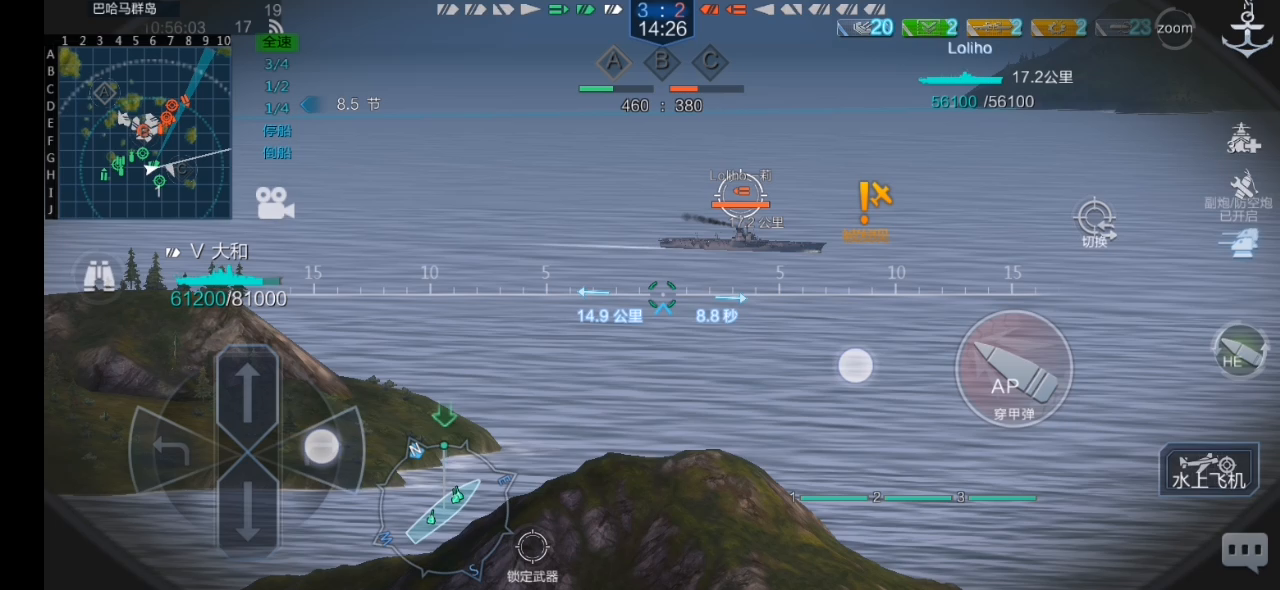 近了还是抽不过装航,真的全瞄主装上的he。但手长掐好距离可以风筝装航头尾。不太适合近距离对炮,但打dd,cl应该很猛(感谢大佬陪我瞎搞)