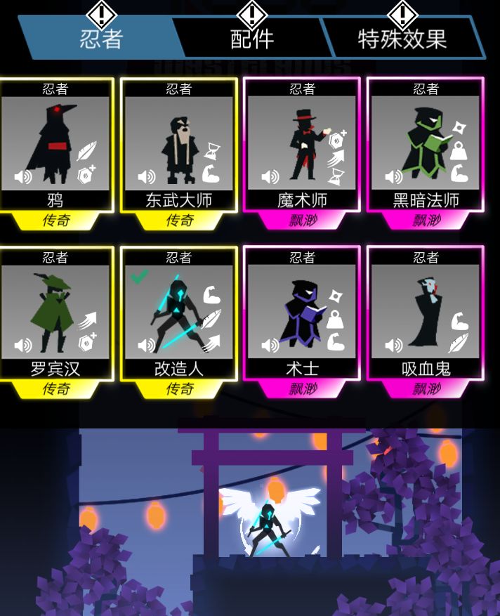 首先绿帽子罗宾汉镇楼各角色技能声音:有独特的人物音效(女忍者,胖忍者,间谍,纸板,功般若,夜般若,猫头鹰,乌鸦,绿帽子,乌鸦,东武大师,机器人)轻快:跳跃距离更远(午夜,夜般若,红般若,绿帽子,机器人)羽毛:掉落速度减慢(白狐狸,猫头鹰,乌鸦,机器人)金币:出现金币的概率提高(狐狸,乌鸦,绿帽子)沙漏:2段跳和3段跳时的子弹时间变的更慢(沙漠,间谍,红沙,猫头鹰,东武大师)沉重:掉落