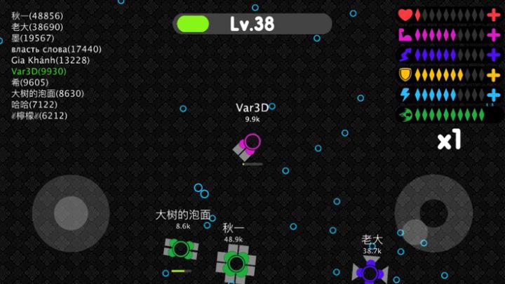 移动你的战车,瞄准那些没有意识的几何体,打爆它们,你将获得初始经验,慢慢升级。每升高1级你会获得一个属性点,用于升级战车属性,得到更强的战斗力。等级到达10级时,你将得到一次升级战车类...
