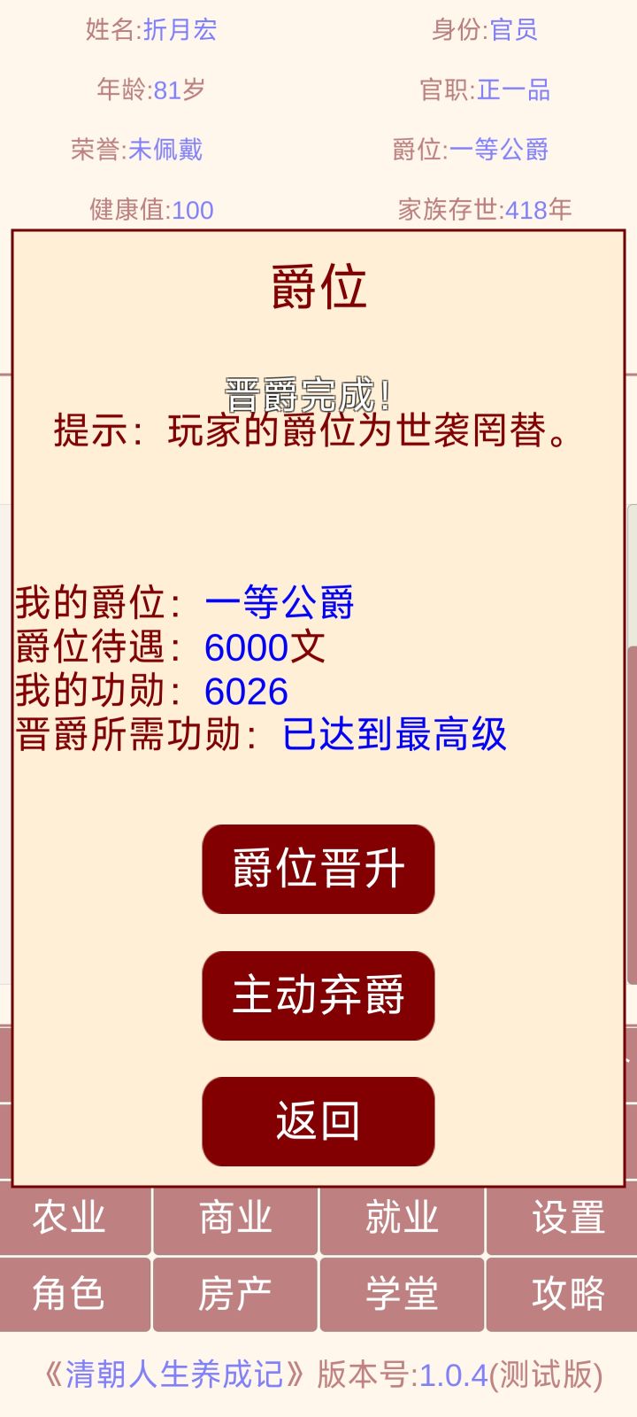 算是比较有意思,可惜不能篡位。几个小建议:1.自动化有的时候会不小心误触关闭,尤其当官,一不小心关闭了没注意就被辞退了,建议增加防误触。2.爵位每一代功勋继承掉的有点猛,希望降低继承损失。3.遗嘱建议可以自行分配给子女,而不是默认分配。4.商会可以增加一点正面事件和负面事件(比如遇到劫匪,关税增高,某地异常缺货价格暴涨等)。5.可以在官职里增加“腐败”选项,玩家每次点击(二次确认提醒,