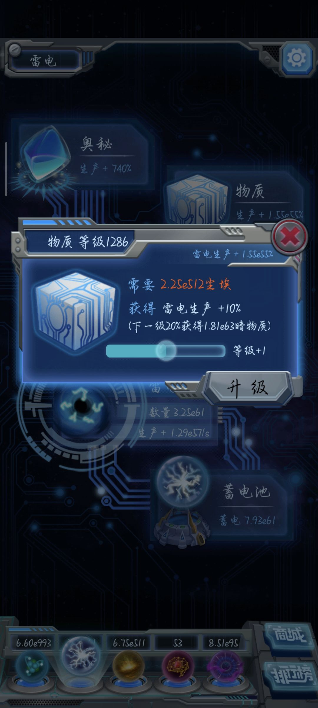 纯本人观点 本人从初中开始玩玩了一年多就不玩了,最近回来看看 (好像排行榜是按入坑时间来划分的,我的排行榜上几乎都是死人了) 不扯了步入正题了 首先后期 雷电的主要来源是暗能量(每十个给一点雷电)(不要全部用完!) 暗物质主要有粒子获得,尘埃这一栏你都可以不点 基本上后期每一炸之后你都能很快回到之前的进度(除了智慧) 粒子主要是多造清理者(造母体就是能加造清理者的数量) 后期基本流程就是 爆炸之后