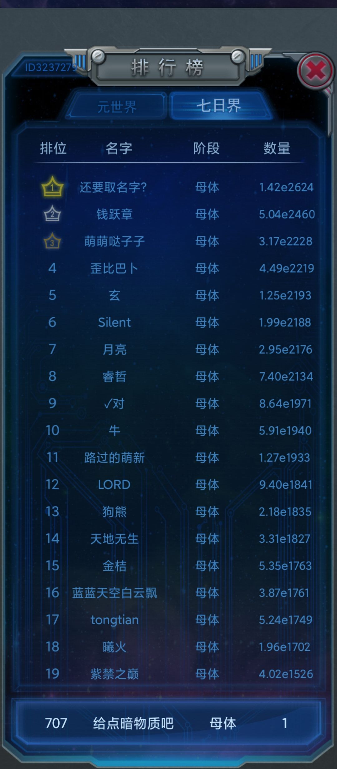 总共用了差不多一年的时间 2022.9.15 创建账号 之前玩的最好的一次只玩到古菌便退游 没有任何经验 纯萌新一枚,开始探索游戏 一周半打到2e9暗物质条件开启一炸(选择速炸母体) 又一周半卡进度2e19暗物质二炸(账号最大失误,因为看了无良帖子的错误指导,请各位一炸后务必直接玩到母体再炸) 又一周半终于玩到母体(至此,养老开始) 达到母体之后几乎不需要什么思考和技巧 三炸--------十九
